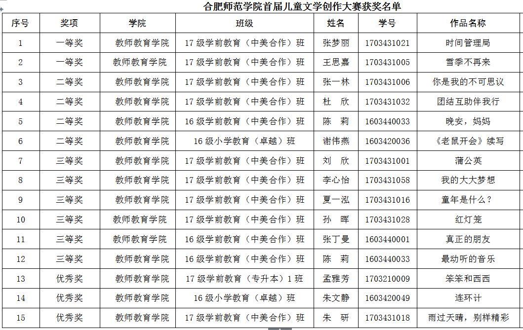 合肥师范学院首届儿童文学创作大赛获奖名单