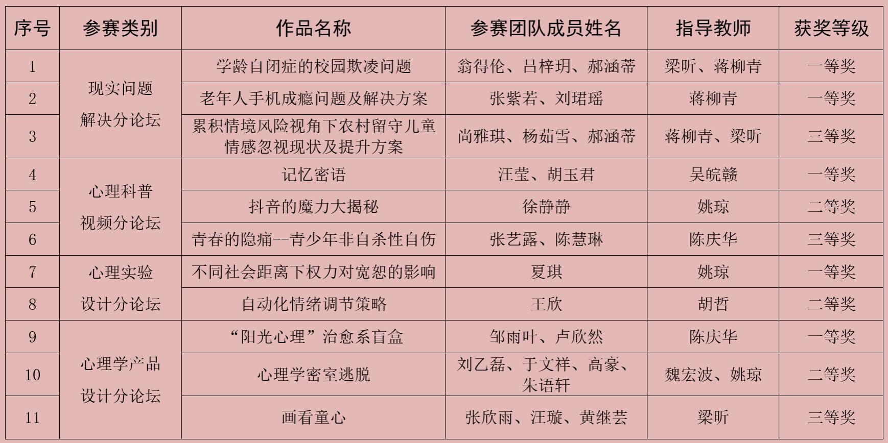 近日,由安徽省高等学校教育学类合作委员会、安徽省心理学会和安徽师范大学教育科学学院共同主办的“安徽省首届心理学专业本科生创新创业论坛”在安徽师范大学落下帷幕。教育与心理科学学院应用心理学专业11个本科生团队获得一等奖5个,二等奖3个,三等奖3个,一等奖数量居参赛院校首位,学校荣获优秀组织奖。