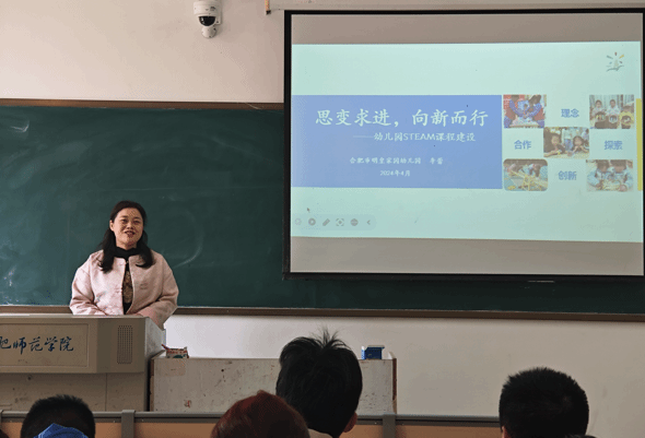 3月28日上午,明皇家园幼儿园园长李蕾在锦绣校区博约楼104教室开展“幼儿园Steam课程建设”主题讲座。李蕾解读了Steam课程对儿童发展的多元支持,分享了其所在幼儿园Steam课程建设及发展历程,重点讲解了“在问题于聚焦中明确行动、在游戏与活动中储备经验、在创新与设计中迭代学习、在交流与发现中自我剖析、在反思与迁移中认知重构”的Steam课程建设整体思路。本次讲座让学生认识到课程是幼儿教育的基础与核心,提升了对幼儿园课程的认识深度,提高了专业认同感和使命感。