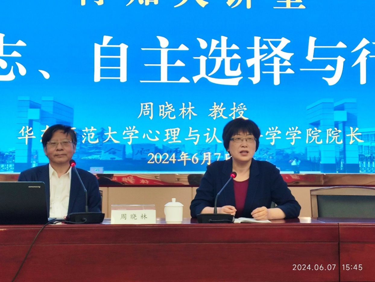 6月7日下午,华东师范大学心理与认知科学学院院长、教育部高等学校心理学教学指导委员会主任委员、长江学者特聘教授周晓林应邀来院作“自由意志、自主选择与行为控制”学术讲座。讲座前,院党委书记徐成钢亲切会见周晓林教授,院党委副书记、院长方东玲,院学术副院长郝宁出席讲座。科研处、研究生处、相关二级学院等单位负责人及各学院骨干教师、辅导员和学生代表共200余人参加讲座。讲座由方东玲主持。