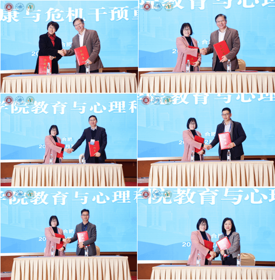 开幕式上,安徽省青少年心理健康与危机智能干预哲学社会科学重点实验室主任方东玲与上海市心理健康与危机干预重点实验室主任周晓林签署了实验室战略合作协议。合肥太阳成集团tyc122cc入口党委书记董萍与华东师范大学心理与认知科学学院院长周晓林、南京师范大学心理学院院长陈庆荣、上海师范大学心理学院副院长罗俊龙、浙江师范大学心理学院院长孙炳海、上海体育大学心理学院院长王小春分别签署了学科共建战略合作协议。
