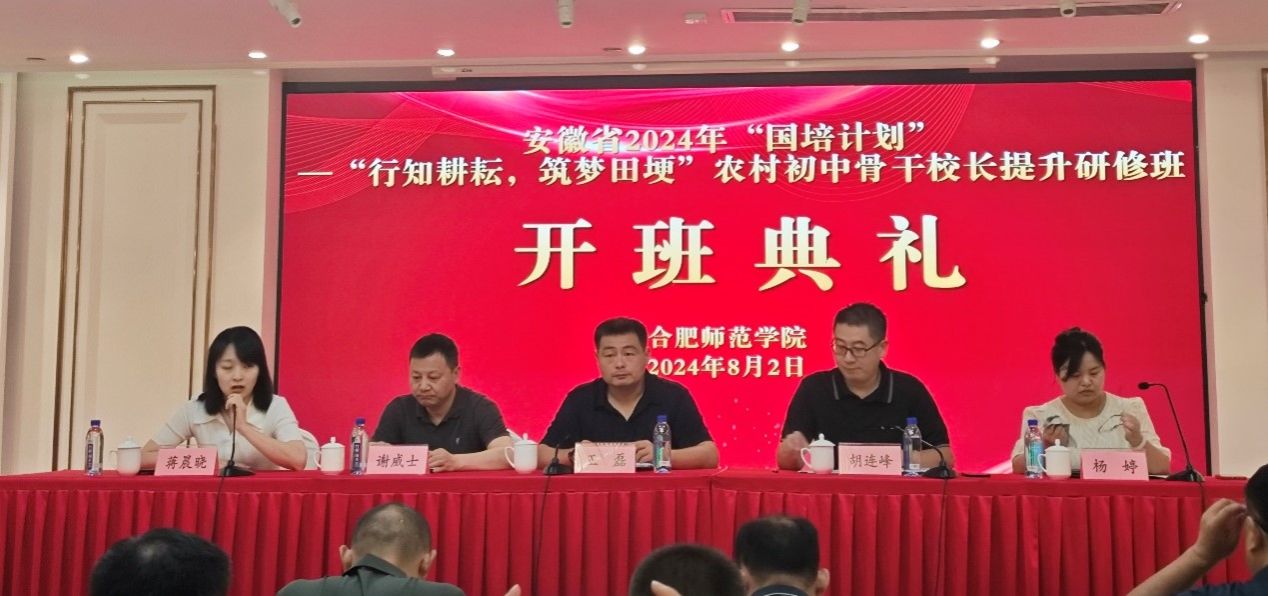 8月2日,由合肥师范学院承办的安徽省2024年“国培计划”——农村初中骨干校长提升研修培训第一阶段集中培训在合肥源牌国际酒店隆重开班。合肥师范学院继续教育学院副院长王磊、教育与心理科学学院副院长胡连峰、教育与心理科学学院培训部主任谢威士、教学班主任杨婷、生活班主任邱爱武与蒋晨晓等领导老师出席开班典礼,来自安徽省16地市61区县农村初中150名骨干校长参加开班典礼,开班典礼由蒋晨晓主持。