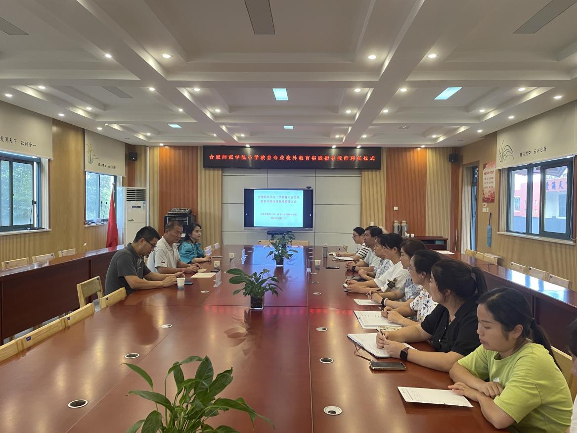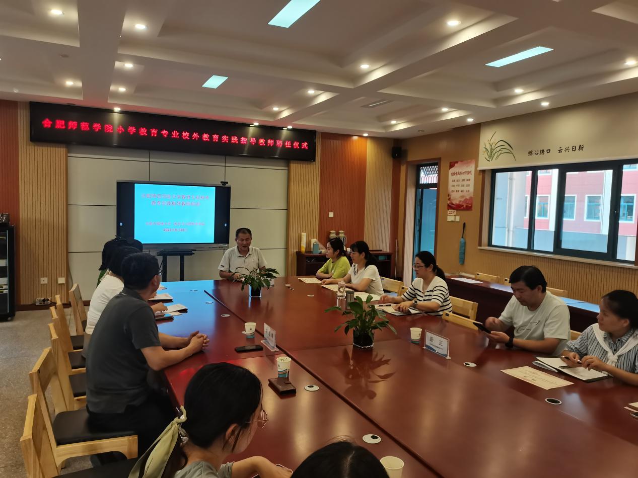 (本网讯)8月23日下午,教育与心理科学学院闫龙副院长、胡连峰副院长、教育系唐银副主任等一行三人赴合肥师范学院附属小学开展小学教育专业校外教育实践指导教师聘任仪式及培训会。合肥师范学院附小校长彭正、学生处史迎春主任以及受聘的15位指导老师出席聘任仪式及培训会。