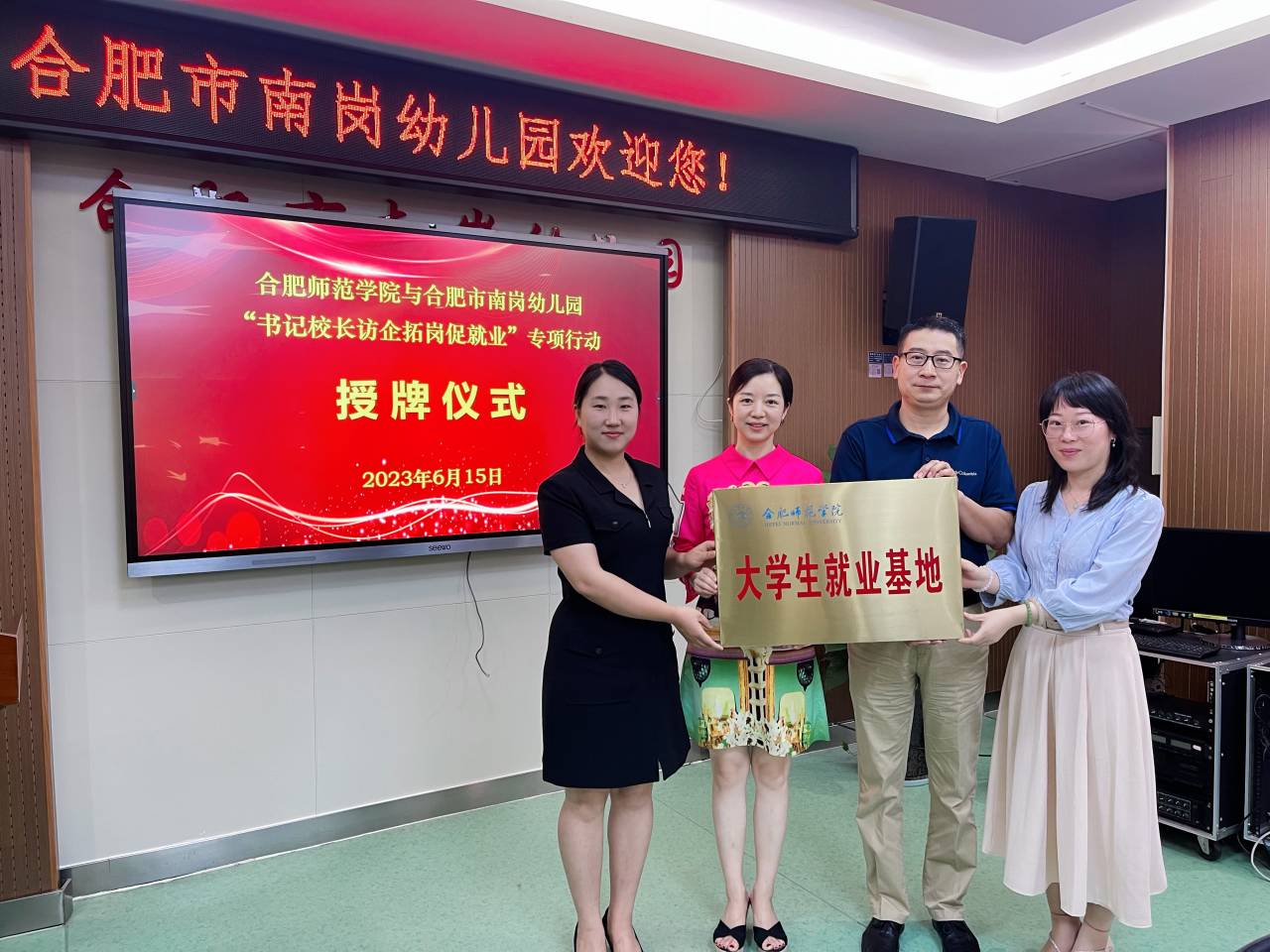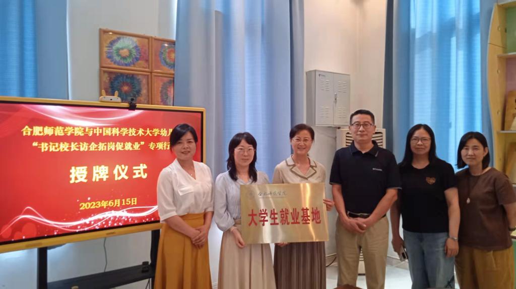 为深入开展学习贯彻习近平新时代中国特色社会主义思想主题教育,进一步落实“访企拓岗促就业”专项行动工作部署,促进毕业生更加充分更高质量就业,6月13至15日,教育与心理科学学院党委书记董萍,副院长胡连峰、胡哲,学前教育系主任孙延永,辅导员代表王磊等赴安徽省水利厅机关幼儿园、安徽省军区机关幼儿园、合肥市南岗幼儿园和中国科学技术大学幼儿园开展考察调研和校企合作交流。
