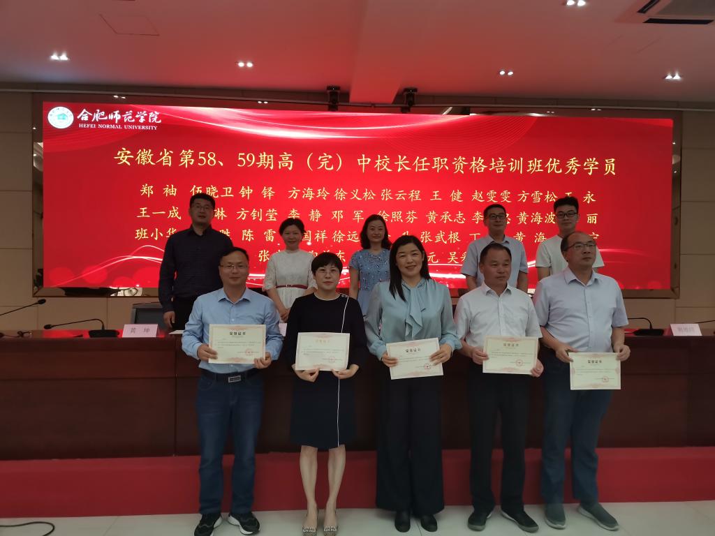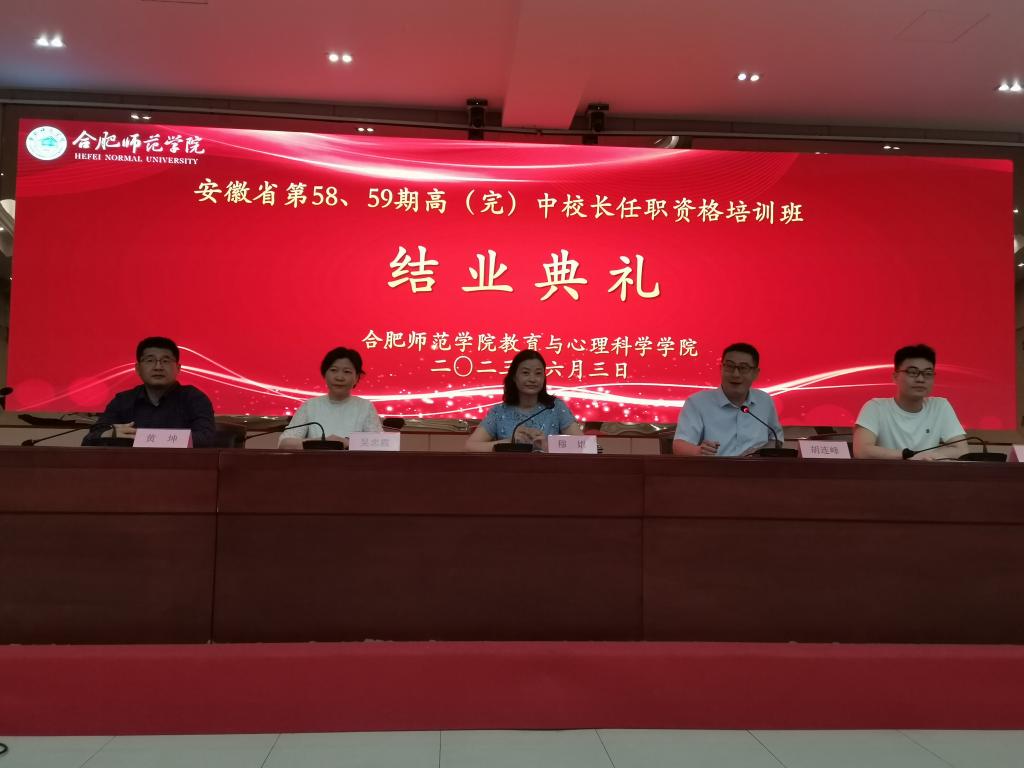 6月3日上午,安徽省第58、59期高(完)中校长任职资格培训班结业典礼在合肥师范学院锦绣校区学术报告厅隆重举行。合肥太阳成集团tyc122cc入口党委书记穆娟、副院长胡连峰、班主任吴忠霞、学生助理荆效闫、学员代表黄坤以及来自全省各地的学员参加了结业典礼。典礼由胡连峰主持。