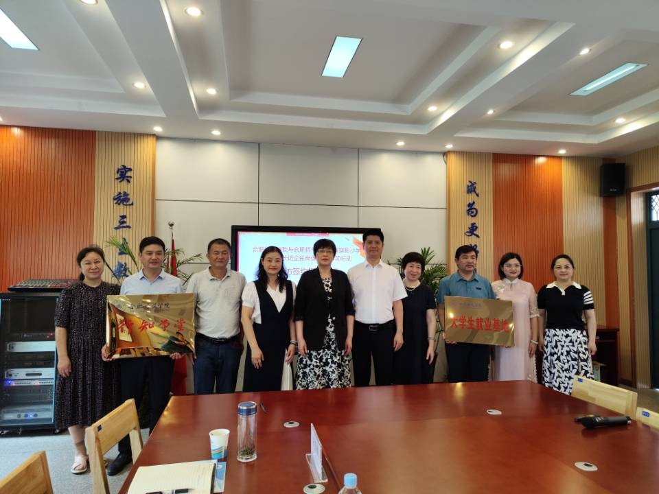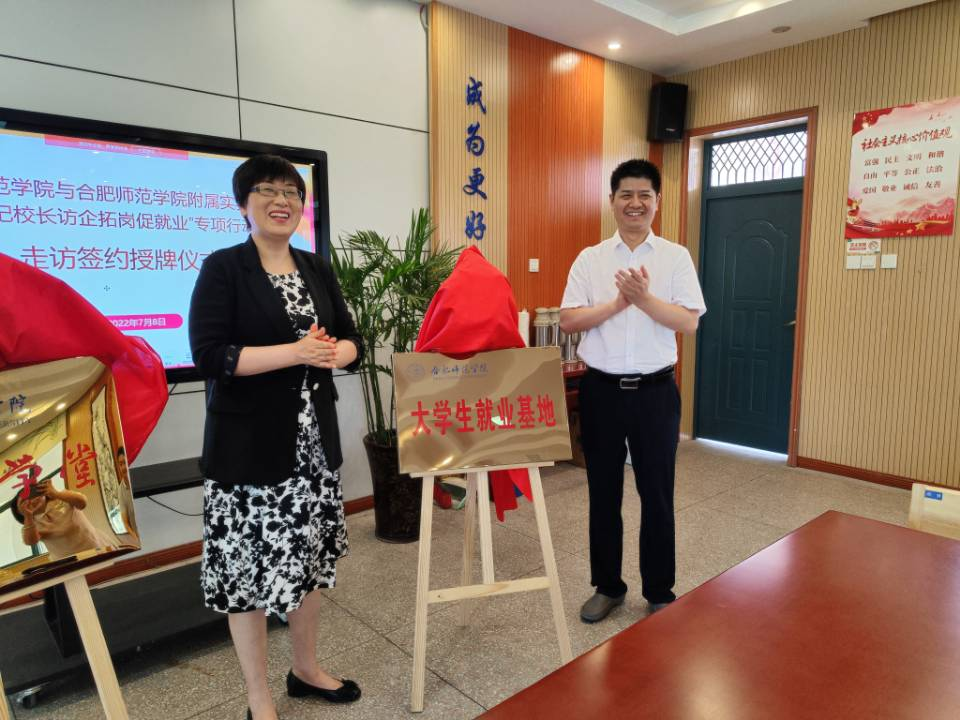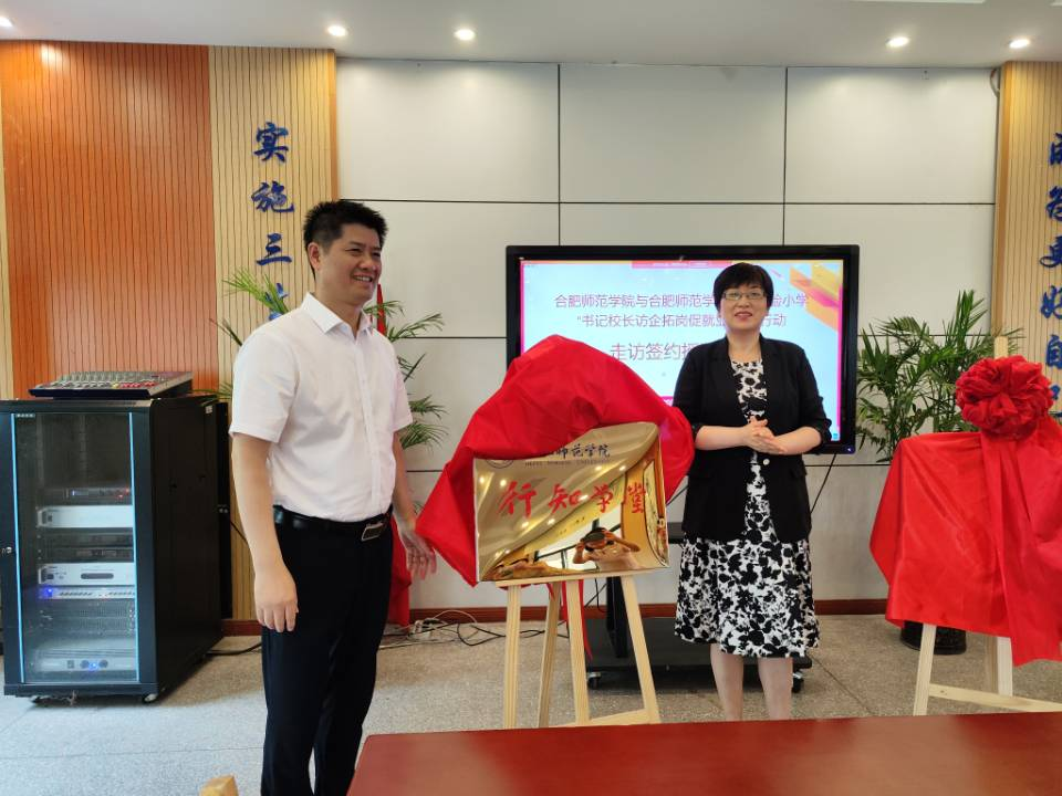 在签约授牌仪式上,方东玲、杨会谦为合肥师范学院附属实验小学大学生就业基地和行知学堂揭牌,李群、彭正签署了合作协议。(教师教育学院:王磊)