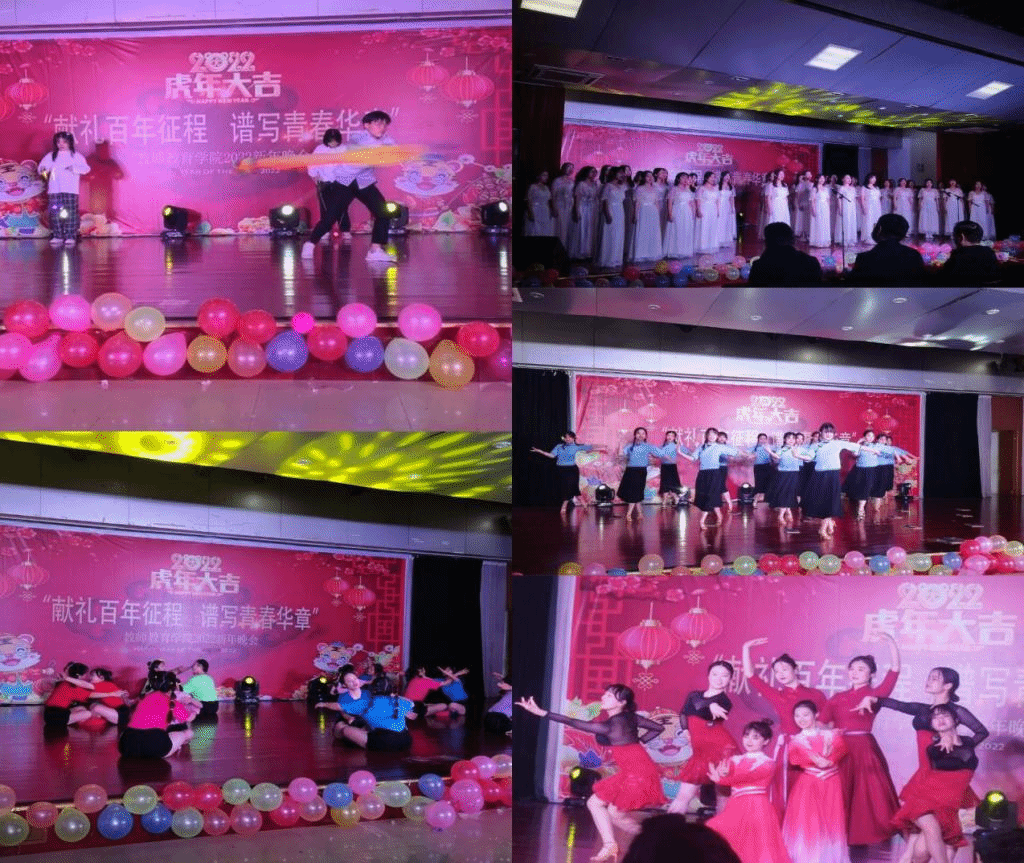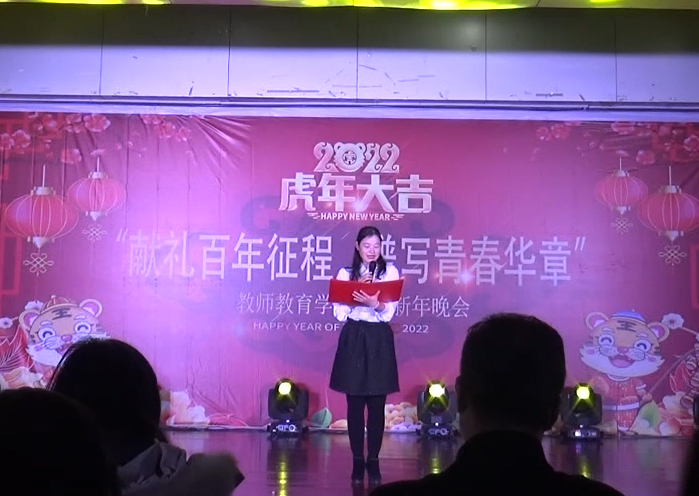 (本网讯)12月21日18点30分,教师教育学院2022年“献礼百年征程,谱写青春华章”新年晚会在锦绣校区大学生活动中心举行。机关第二党委书记钱立青、后勤处处长舒剑、物理与材料工程学院党委书记唐洁、宣传部副部长赵波、院团委副书记刁文彬、教师教育学院党委书记穆娟、院长李群、副院长闫龙以及教师教育学院师生欢聚一堂,共迎新春,共同欣赏丰富多彩的文艺表演。晚会还特别邀请合肥市明珠幼儿园党支部书记王俊、合肥市明珠幼儿园总园长周盼盼参加。