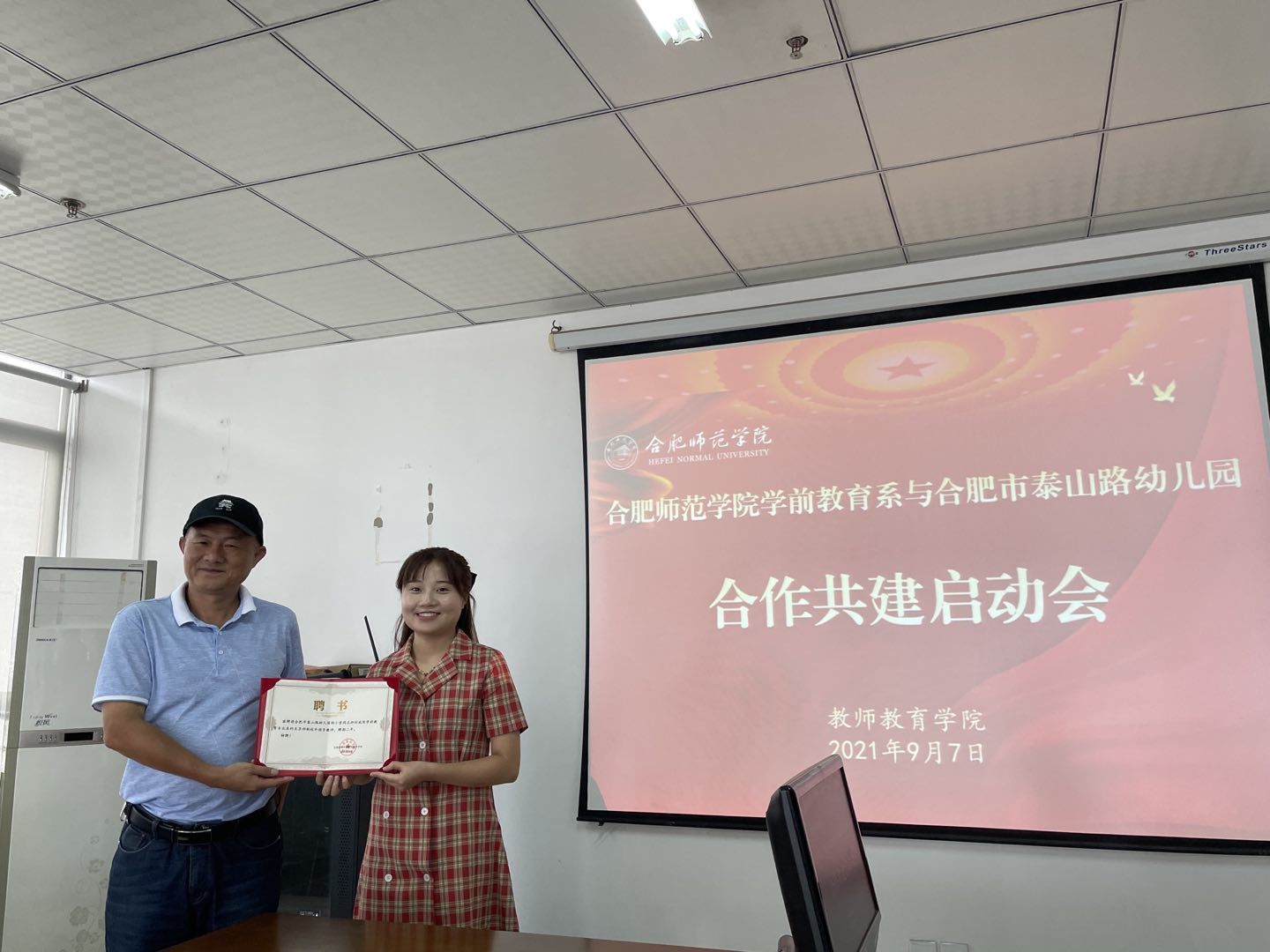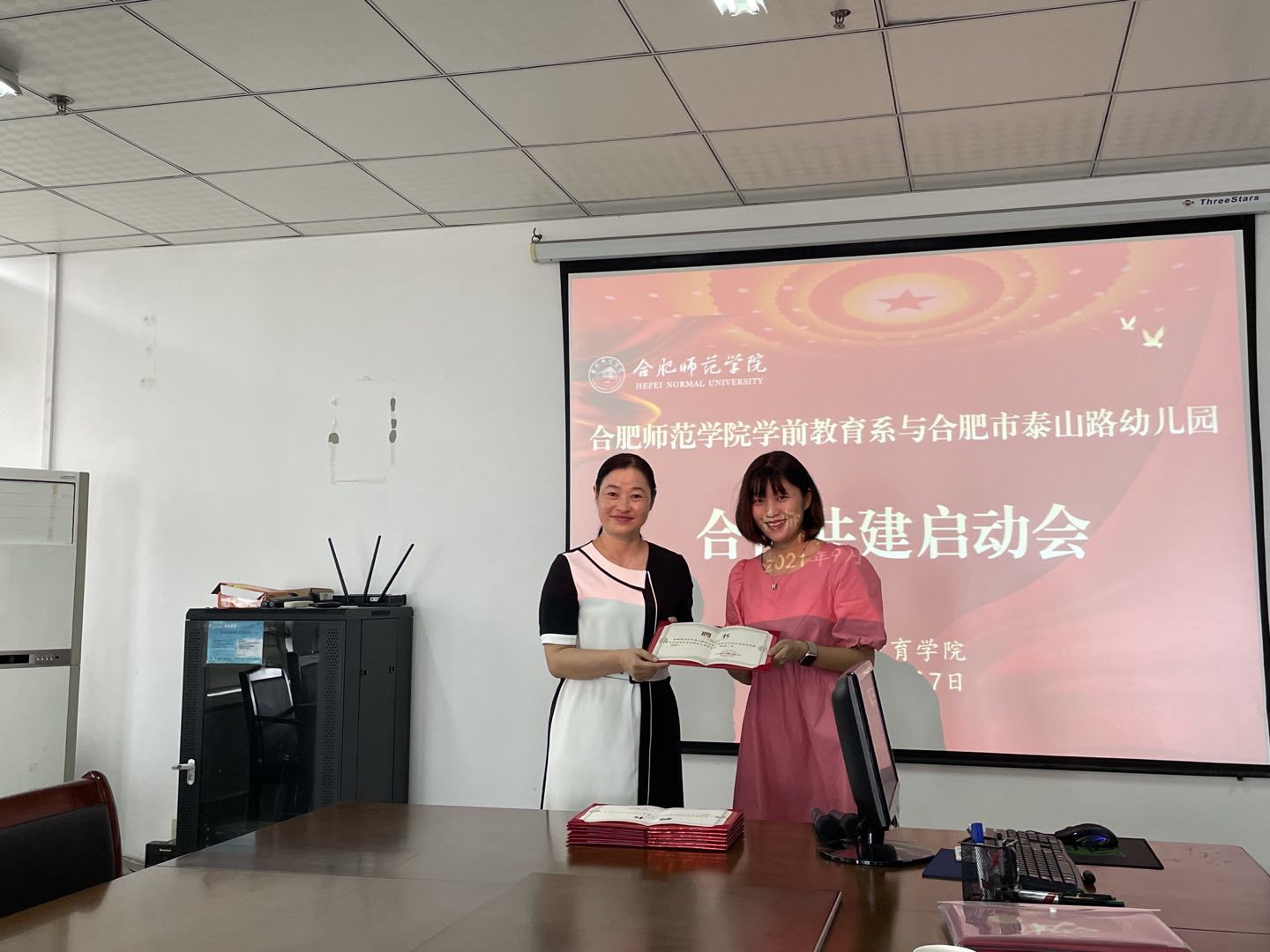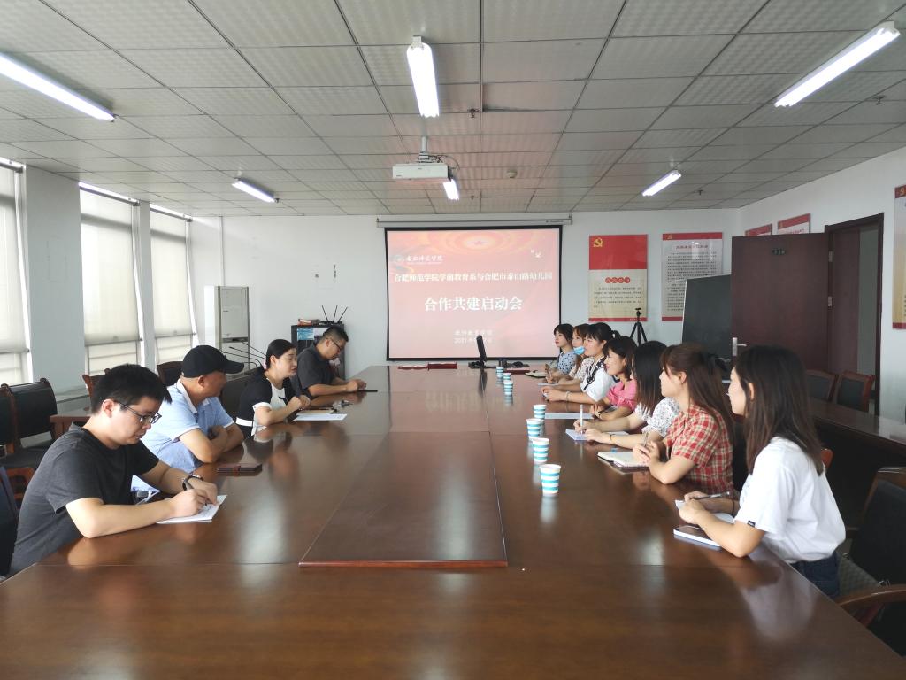 (本网讯)9月7日上午,合肥师范学院教师教育学院学前教育系与合肥市泰山路幼儿园合作共建启动会在行知楼710举行。教师教育学院党委书记穆娟、副院长闫龙、学前系学科带头人胡连峰、学前系教师李辉,合肥市泰山路幼儿园园长华琳琳,教学主任徐晓,后勤主任秦蓉和骨干教师等参加启动会。