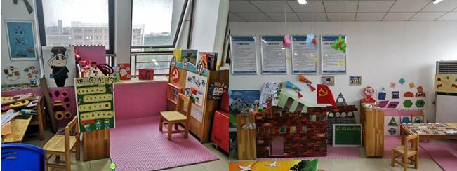 同学们结合专业教育实际,分为主题墙、图书角、益智区、表演区、美工区、游戏区等六个部分作为环创内容。其中,2020级学前教育专升本1班以“重走长征路,共筑儿童梦”为主题开展实践。