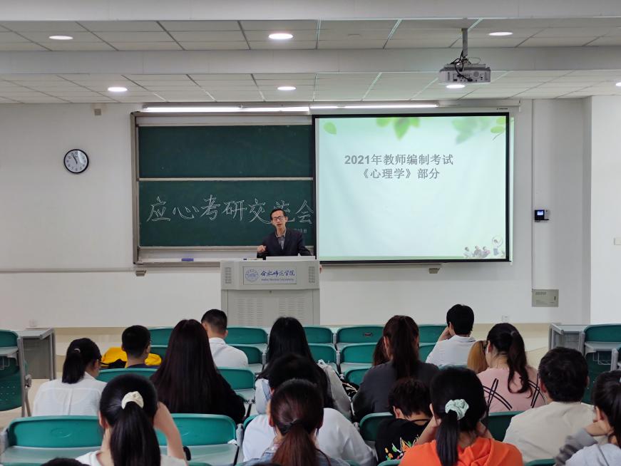 考编、教师资格考试辅导环节中,蒋名平向大家介绍了教师编制考试和教师资格考试的内容与流程,指出了教师考编的难度和挑战性,强调了教师资格证的重要性,着重分析了2021年教师编制考试《心理学》部分的流程以及考试的重点与方法以及题型。随后,晋玉结合与之合作的小学,针对应用心理学专业学生,特别提出在备考心理健康教育学科教师资格的同时,可以根据自己未来的职业规划学习其他学科的专业知识,进行双证考试,增强自己的岗位竞争力。