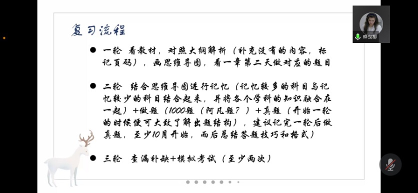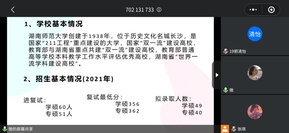 考研交流会由成功考取浙江师范大学、北京师范大学和湖南师范大学的心理学方向研究生的程慧、刘文婕、刘海燕3位2017级同学通过腾讯会议的方式交流分享考研心得。3位同学结合个人经历,从前期规划准备、录取学校介绍、复习参考书目、学习流程和策略、实际作战经验和教训、良好的考研心态等方面进行了详细地讲解。3位同学还对大家现场的疑问做了一一解答。