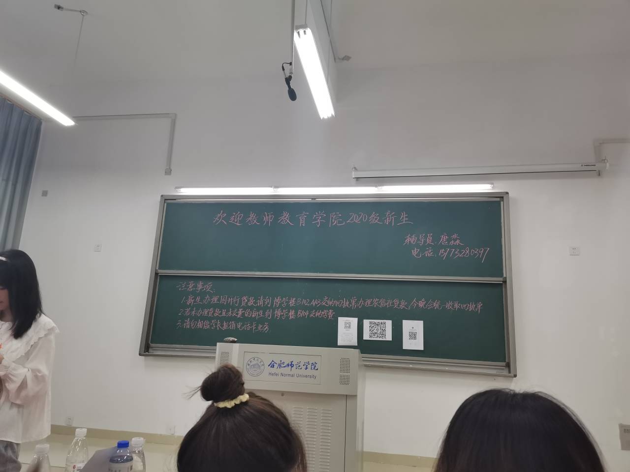 另一处迎新工作点设在博学楼B107教室,新生前往博学楼B107办理入学手续,领取一卡通,为方便新生快速适应大学校园生活,教室的黑板上还写明了入校注意事项,提醒新生做好人身财产安全防护。