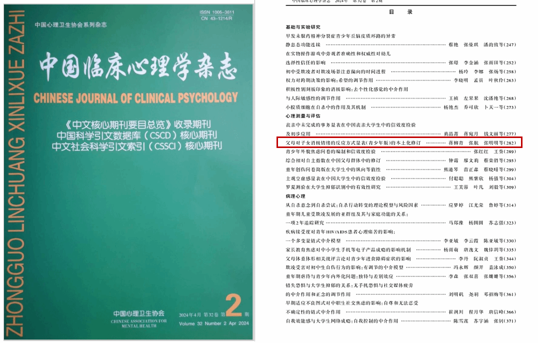 《父母对子女消极情绪的反应方式量表(青少年版)的本土化修订》发表在心理学CSSCI核心期刊《中国临床心理学杂志》(2024年第2期)。合肥太阳成集团tyc122cc入口为论文的第一单位,该研究工作得到青少年心理健康与危机智能干预安徽省哲学社会科学重点实验室开放课题重点项目的资助。(教育与心理科学学院)