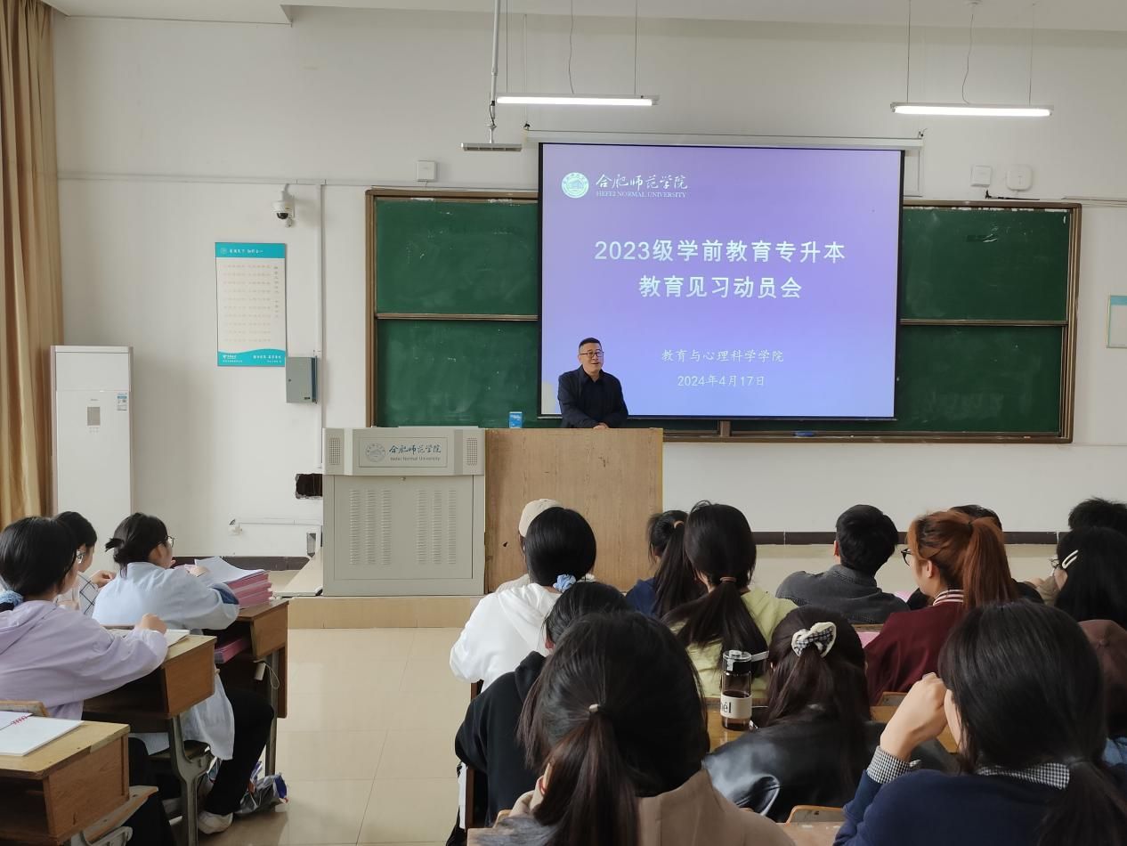 为进一步提升学生实践能力,树立正确的职业理想,4月17日下午,教育与心理科学学院学前教育系在锦绣校区博约楼201教室召开2023级学前教育(专升本)教育见习动员会。教育与心理科学学院副院长胡连峰、学前教育系副主任蒋晨晓出席会议,2023级学前教育(专升本)全体学生参加会议。