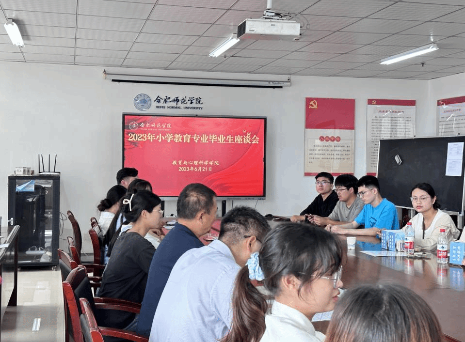 (本网讯)为深入调研小学教育专业毕业生对人才培养的意见建议,6月21日下午,教育与心理科学学院在锦绣校区行知楼710会议室召开2023届小学教育专业毕业生座谈会。教育与心理科学学院副院长胡连峰和2023届小学教育专业30余位毕业生代表参加会议,教育与心理科学学院副院长闫龙主持会议。